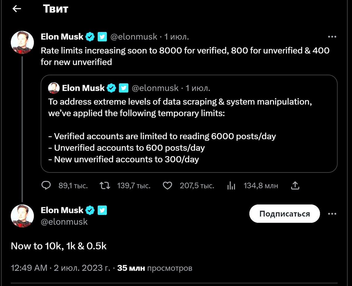 Появление этих сообщений совпало с объявлением Маском о введении ограничений на количество твитов, который пользователь сможет прочитать за сутки. Ввод новых правил происходил в свойственной Маску эксцентричной манере. Лимиты за день менялись трижды. В первом сообщении миллиардер сообщил, что новым пользователям соцсети покажут 300 твитов, старожилам выделят 600 сообщений, а владельцам подписки Twitter Blue дадут прочитать 6000 постов. После бури возмущенных комментариев Маск смягчился и пообещал увеличить дозу до 400, 800 и 8000 твитов, в зависимости от ранга читателя. Но соцсеть не умолкала, и босс в очередной раз уступил: лимиты были увеличены до 500, 1000 и 10000 постов, соответственно.