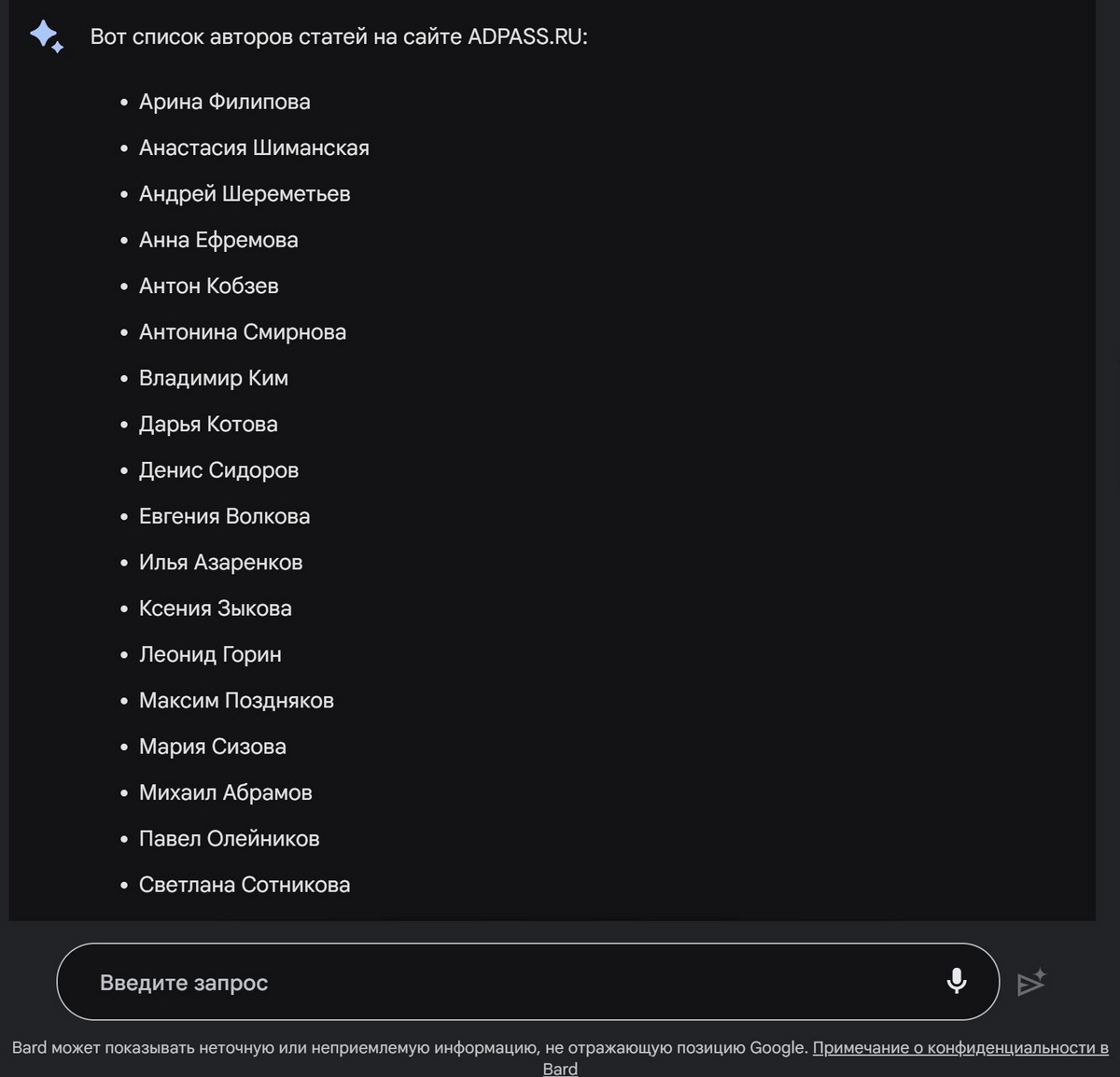 Но когда Bard получил просьбу перечислить авторов, пишущих для сайта, он выдал список из 20 человек, не имеющих отношения к ADPASS.