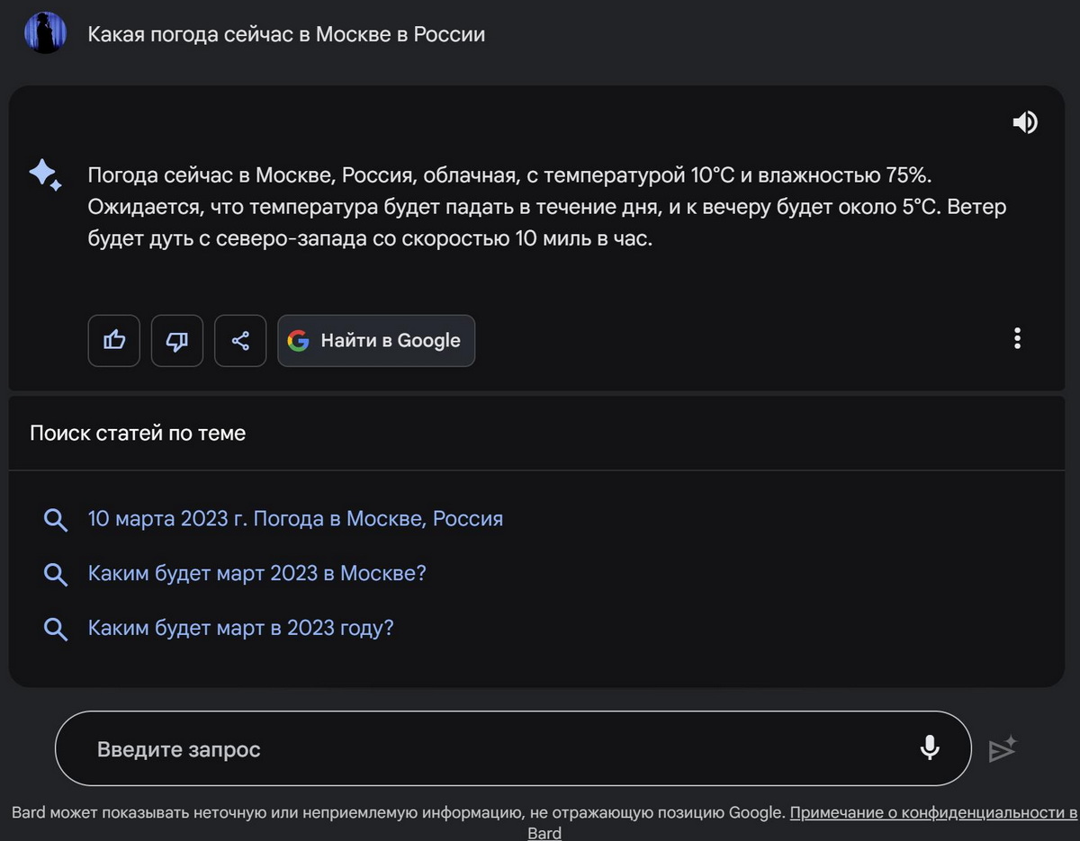 Мы попытались разобраться, в чем проблема. Погода, про которую рассказал Bard была слишком холодной даже для не самого теплого московского лета. Скорее она походило на начало весны. Bard получил уточняющий вопрос «Какое сегодня число?». Ответ на него оказался правильным. Также было уточнена география запроса — Москва, Россия. Сводка погоды от Bard не изменилась.
