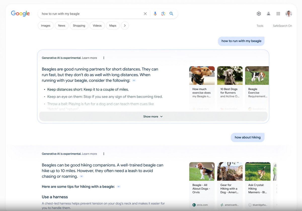 Пока неясно и то, как именно будет работать поиск Google, основанный на возможностях ИИ. В прошлом году поисковик запустил опцию SGE (Search Generative Experience, «Генеративный опыт в поиске»). Тем, кто активировал ее в разделе экспериментов Google Labs, над обычным списком ссылок на странице выдачи показывается блок с ответами, сгенерированными искусственным интеллектом, и возможностями для более глубокого изучения результатов в диалоге с чат-ботом.