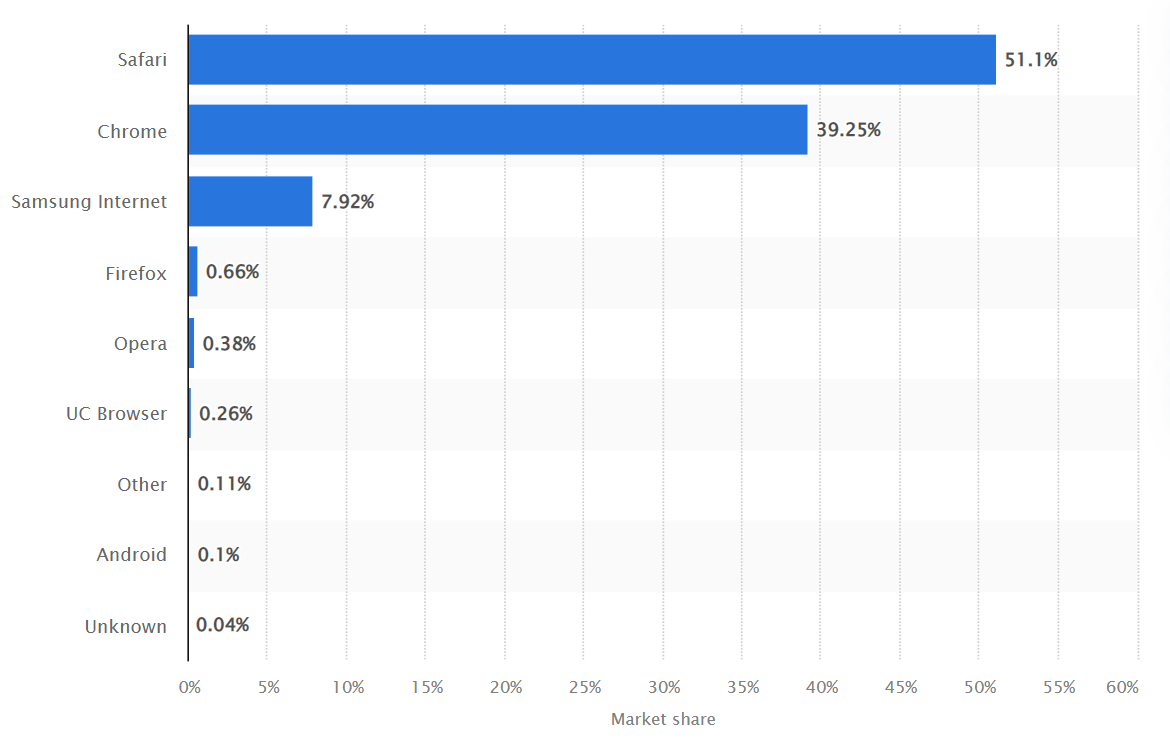 По данным сервиса Statista.com в декабре 2021 года Google Chrome и Apple Safari — 90,35% рынка мобильных браузеров в Британии.