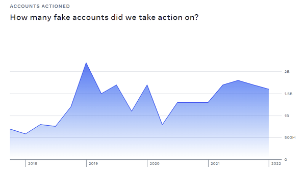 О масштабах распространения поддельных аккаунтов можно судить по данным компании Meta*. В своем «Отчете о соблюдении стандартов сообщества за первый квартал 2022 года» она сообщила, что только за этот период было удалено 1,6 млрд фальшивых аккаунтов.