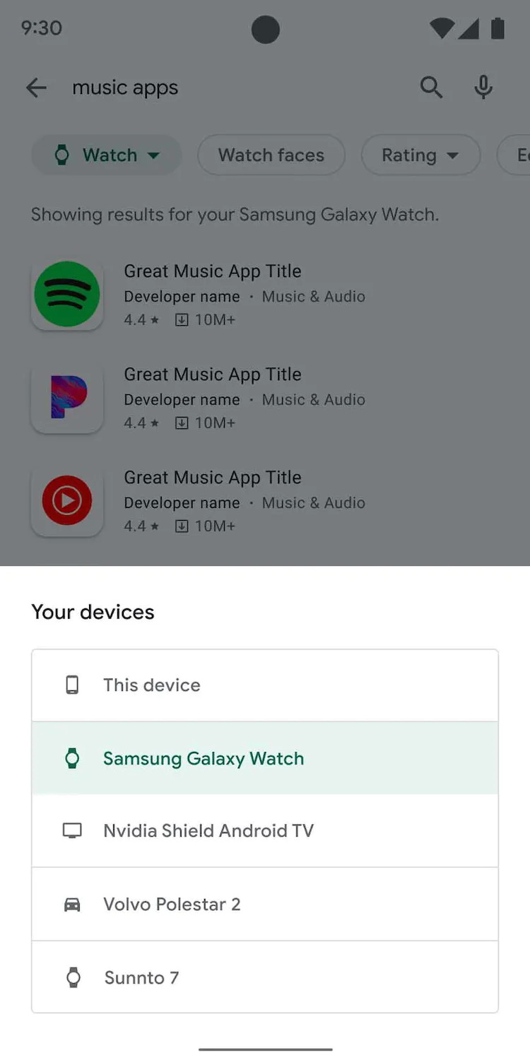 Первое обновление для Google Play добавляет новые домашние страницы для устройств, работающих на Android, которые не являются смартфонами: часов, телевизоров и автомобилей. Под окном поиска появилась новая вкладка, нажав на которую можно увидеть перечень типов устройств, объединенных под учетной записью пользователя. Выбрав нужный класс, пользователь попадает в раздел, где видит приложения, доступные для его часов, телевизора или автомобиля.
