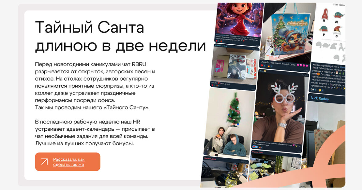 Заимствуя интересные идеи, мы всегда добавляем в них что-то свое. Например, наш «Тайный Санта» — это не просто обмен подарками, а настоящий праздник креатива. В декабре офис превращается в сказочное место, в чатике — море открыток, стихов и песен. Поиски подарков превращаются в увлекательные квесты. Уже и предновогодние дедлайны кажутся не такими пугающими, когда ты знаешь: твой Тайный Санта уже готовит какой-то сюрприз.