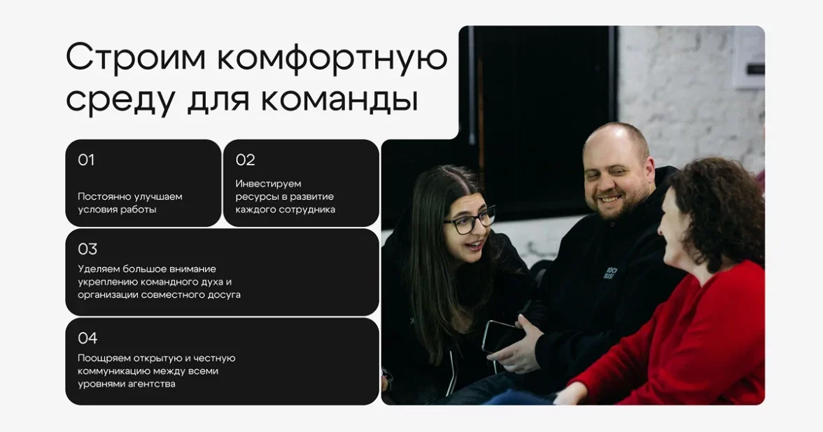 Для нас важно, чтобы работа приносила удовольствие, а не превращалась в рутину. Средний возраст наших сотрудников — 25 лет. Молодым, энергичным и амбициозным специалистам необходимы новые впечатления для отдыха и вдохновения.