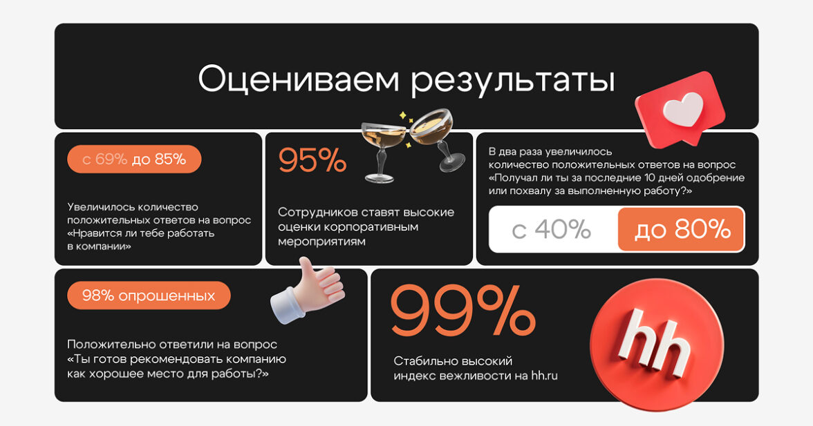Победа над выгоранием в офисе Rocket Busness — результат последовательной работы. Мы написали эту статью, чтобы показать, какими способами можно создать безопасную среду, в которой сотрудники смогут работать спокойно и с удовольствием. По данным наших регулярных опросов, к концу 2024 года 100% сотрудников были вовлечены в корпоративную жизнь.