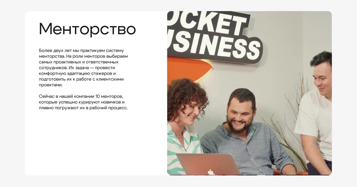Не бросаем новых сотрудников один на один с задачами. У каждого новичка есть ментор, который помогает ему освоиться в течение первого месяца стажировки.