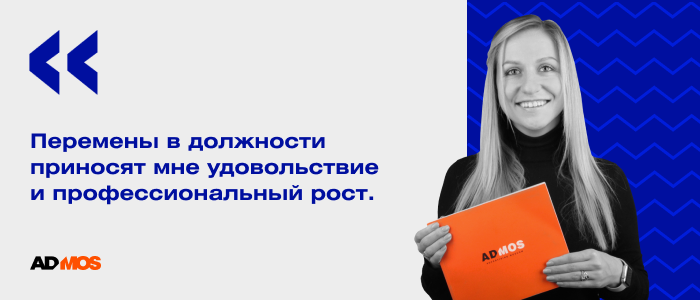 «В ADMOS я прошла длинный, интересный и нелёгкий путь от новичка без опыта работы в данной сфере до руководителя отдела продаж. Компания максимально открыта сотрудникам, и с первого дня мы понимаем, что и как делать, чтобы расти в должности вертикально или горизонтально. Обучения, кооперации со смежными отделами, общие проекты помогают понять, что тебя максимально драйвит и в каком направлении двигаться».