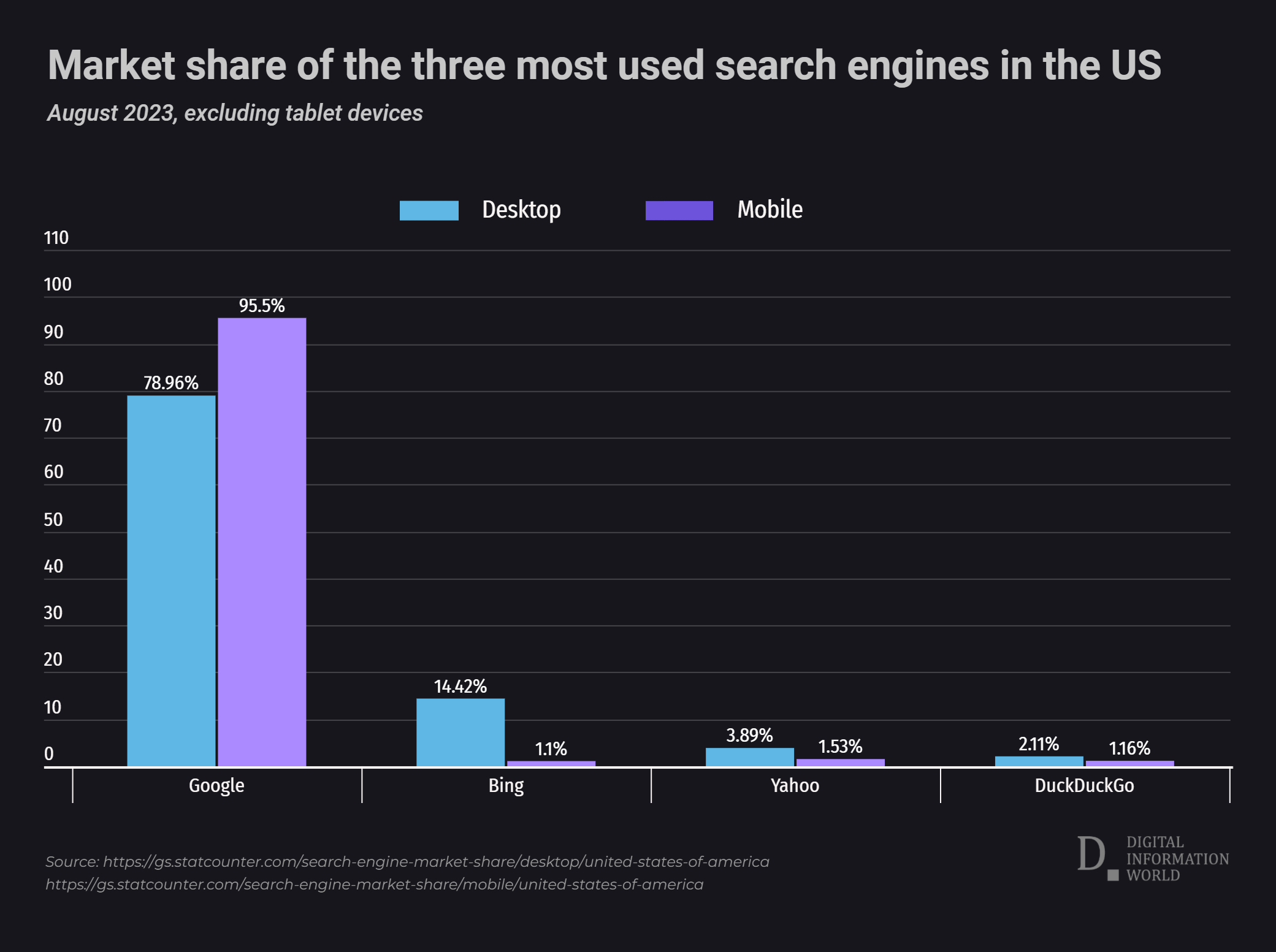 На сегодняшний день Google контролирует 78,96% поиска на десктопах и 95,6% — на мобильных устройствах. Единственным относительно успешным конкурентом компании является поисковик Microsoft Bing, которому удалось занять 14,42% поискового рынка. Доля остальных компаний, предоставляющих такие сервисы, мизерна и исчисляется процентами.