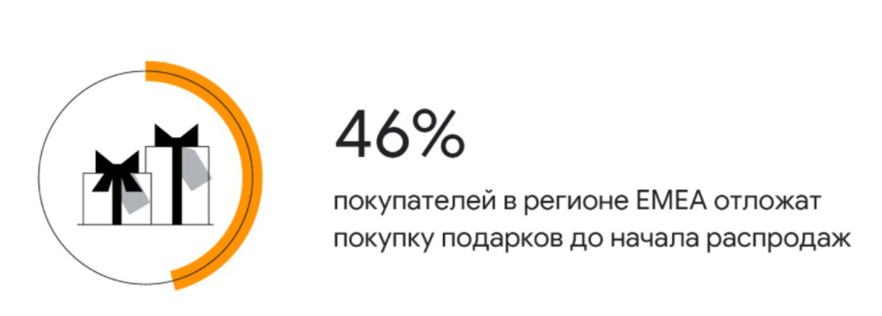 Однако на фоне роста сбережений у одних, другие испытывают финансовые трудности: вместе с более внимательным отношением к тратам это привело к тому, что 46% покупателей в регионе ЕМЕА планируют отложить покупку подарков до начала распродаж. В России тоже предпочитают запасаться подарками на крупных распродажах, таких как «Черная пятница» и «Киберпонедельник».