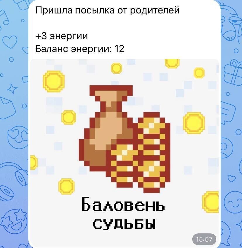 Раз в 12 часов игроку приходит сообщение с рандомным событием — позитивным либо негативным. Позитивные дают от 3 до 20 очков энергии, негативные отнимают от 3 до 20 очков.