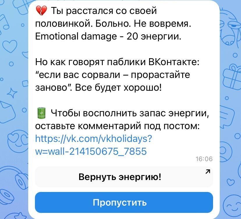 Если у игрока 0 очков энергии, мы отправляем ему сообщение с «бесплатными» очками, чтобы он мог вернуться в игру. Пример: «0 очков энергии — Критический уровень! Чип и Дейл спешат на помощь! Вы заработали +30 очков энергии».