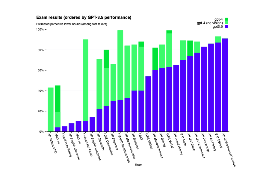 Различие между GPT-4 и его предшественником GPT-3.5 в обычном разговоре разработчики называют тонким. Но OpenAI утверждает, что новая модель «более творческая и комплексная, чем когда-либо прежде», «может решать сложные задачи с большей точностью». И предлагает убедиться в улучшенной производительности машины на основании сданных GPT-4 экзаменов Uniform Bar Exam, LSAT, SAT Math и SAT Evidence-Based Reading & Writing, результатов олимпиады по биологии так далее. По результатам некоторых тестов нейросеть вошла в 10% лучших студентов.