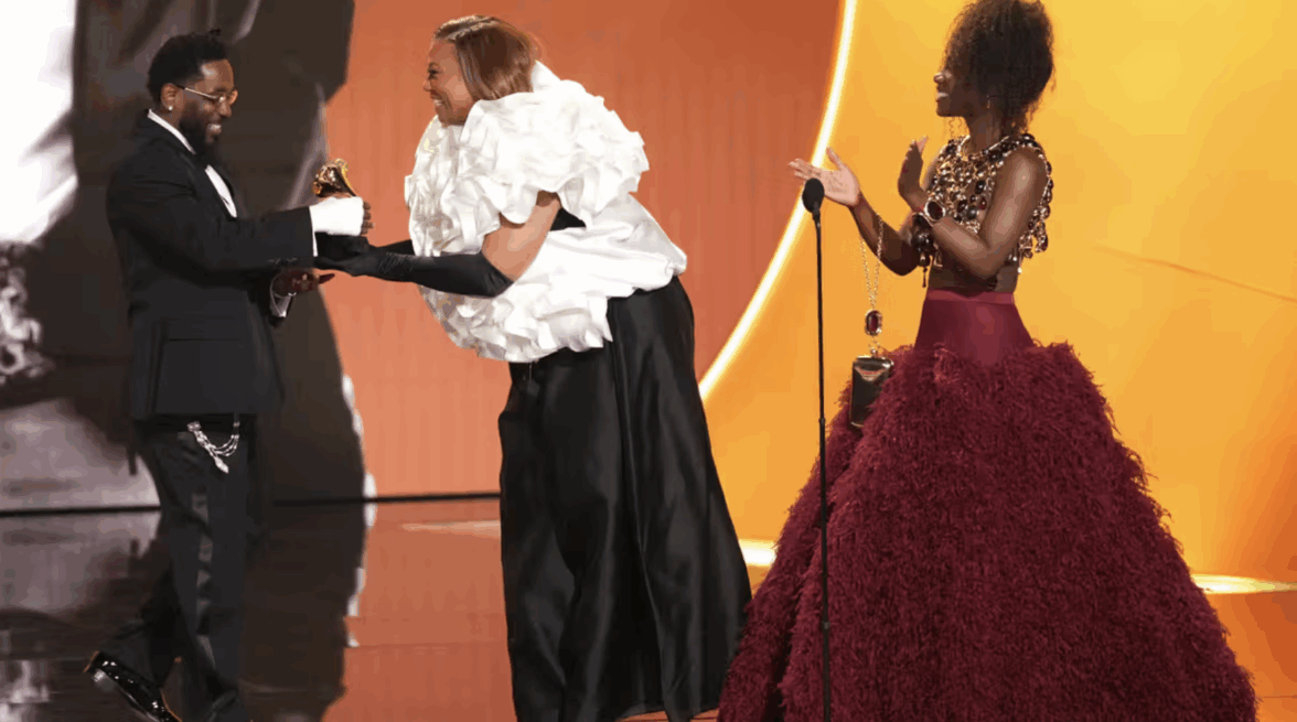 Куин Латифа вручает золотой граммофон Кендрику Ламару. Справа — Доучи