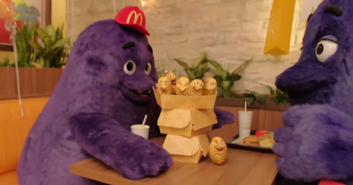 Уродца отряхнули от нафталина, сняли с ним унылый промо-ролик для ТВ и интернета и ввели в меню американских “макдаков” сет «День рождения Гримасы». Он включал в себя Биг Мак или 10 наггетсов, картофель фри и ягодный молочный коктейль фиолетового цвета — Grimace Shake.