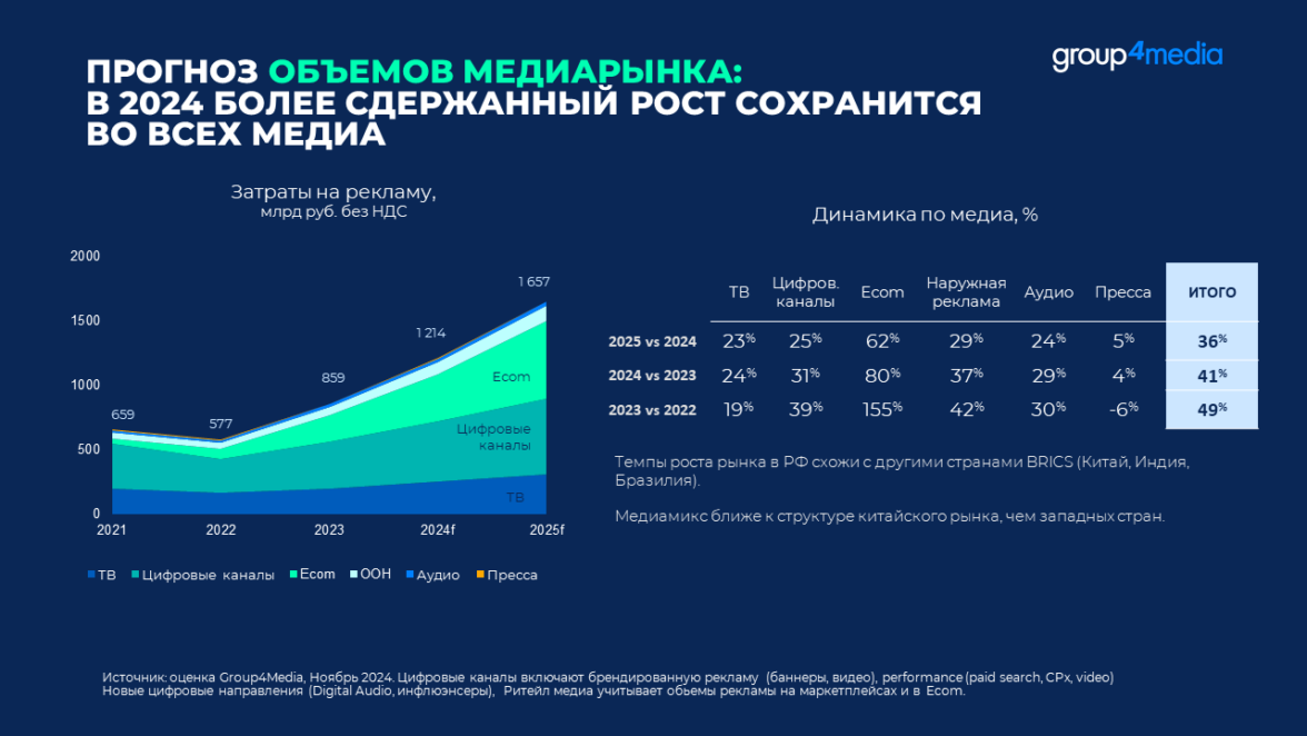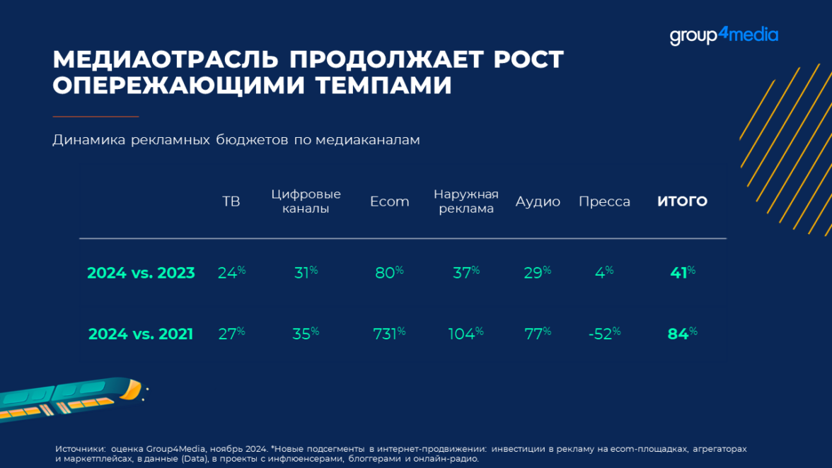 Рекламный холдинг Group4Media представил свой прогноз развития российского медиарынка в 2024 и 2025 гг. Обновленная оценка 2024 года близка к прогнозу, публиковавшемуся ранее в июле. Это говорит о том, что рекламный рынок приобрел определенную стабильность и предсказуемость краткосрочного развития. В 2024 г. рост показывают все медианаправления: ТВ — 24%, диджитал — 49% (цифровые каналы — 31%, еcom — 80%), наружная реклама — 37%, аудио — 28%, пресса — 4%.
