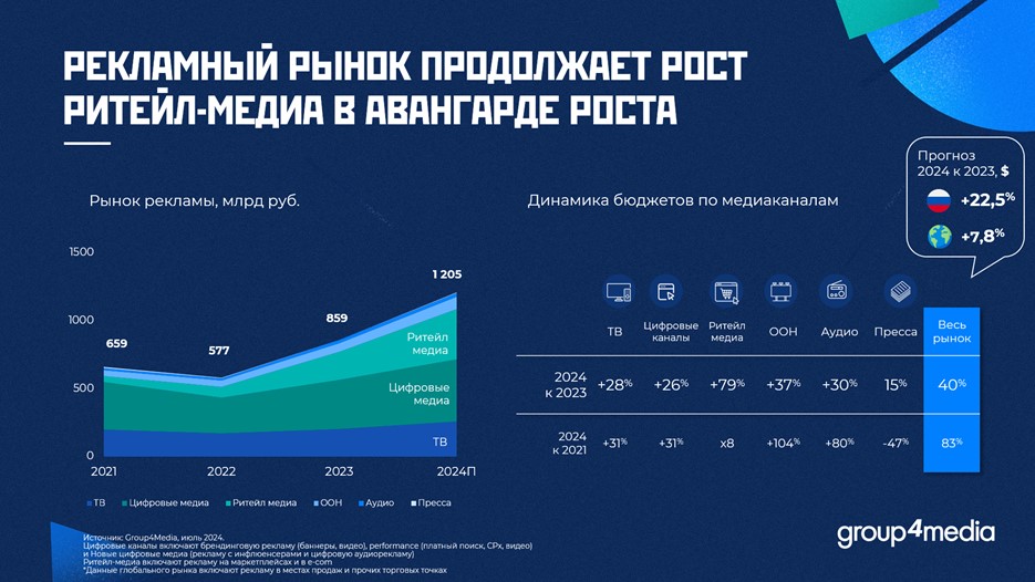 Прогнозируемое снижение динамики роста ВВП уже не будет оказывать столь значимого эффекта на российский рекламный рынок. Это следствие, с одной стороны, адаптации экономики России к действующим санкциям, а с другой — фундаментальных структурных изменений в ВВП. Наибольший рост инвестиций в рекламу уже не первый год приходится на маркетплейсы и электронную коммерцию.