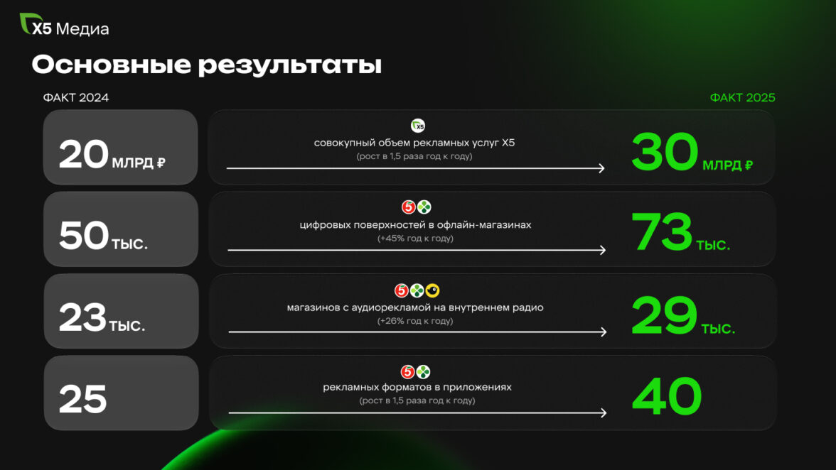 В 2025 году усилия X5 Медиа были сфокусированы на активном развитии рекламного инвентаря в приложениях и офлайн-пространствах торговых сетей. По итогам года ежедневный охват рекламных возможностей Х5 составил 30 млн покупателей.