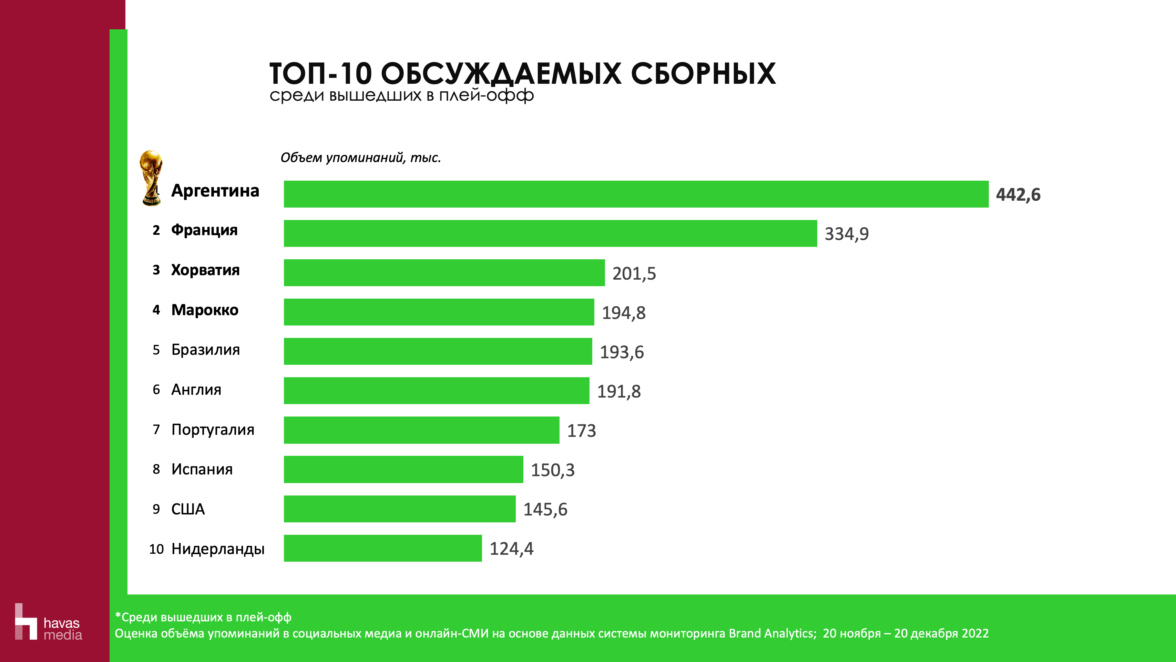 По оценкам Havas Media, на основе данных системы мониторинга Brand Analytics было зафиксировано более 1,7 млн упоминаний мундиаля (20 ноября — 20 декабря 2022), что на 15% меньше, чем у Олимпиады 2022 за время ее проведения — число упоминаний составило около 2 млн. Основными площадками для обсуждения среди россиян стали ВКонтакте (33%), Telegram (21%) и новостные ресурсы (35%). На финал ЧМ 2022, в свою очередь, пришлось около 330 тыс. упоминаний. Интересен тот факт, что четверка сборных, лидеров по упоминаниям, совпадает с занятыми местами на чемпионате.