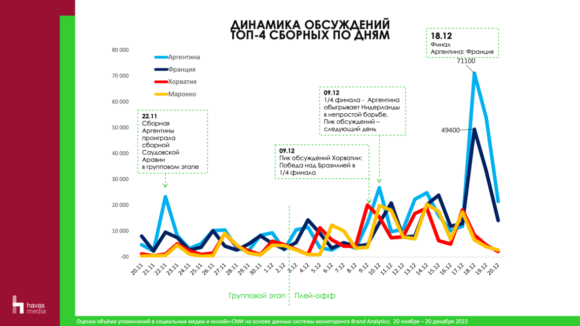 Рост обсуждений наблюдается на стадии плей-офф. На групповом этапе только проигрыш Аргентины Саудовской Аравии вызвал пик упоминаний. Горячие игры долго держали интерес: пики обсуждений ключевых игр наблюдались на следующий день после игры.