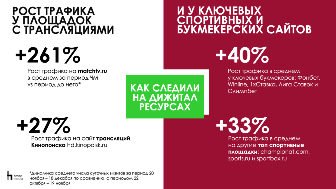 Самый существенный рост трафика наблюдался на сайте Матч ТВ и составил 261%. Также трансляция велась на сайте Кинопоиска, что позволило площадке привлечь 27% трафика. Рост трафика на ключевых спортивных и букмекерских сайтах в среднем составил 30–40%.