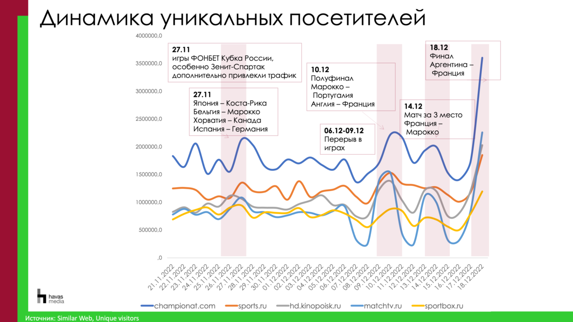В день финального матча Аргентина-Франция был достигнут максимальный рост трафика на спортивные сайты и онлайн-площадки, транслирующие матчи. Уровень колебания трафика возрастал ближе к четверти финала чемпионата — наблюдались общие пики у всех сайтов в дни ключевых матчей.