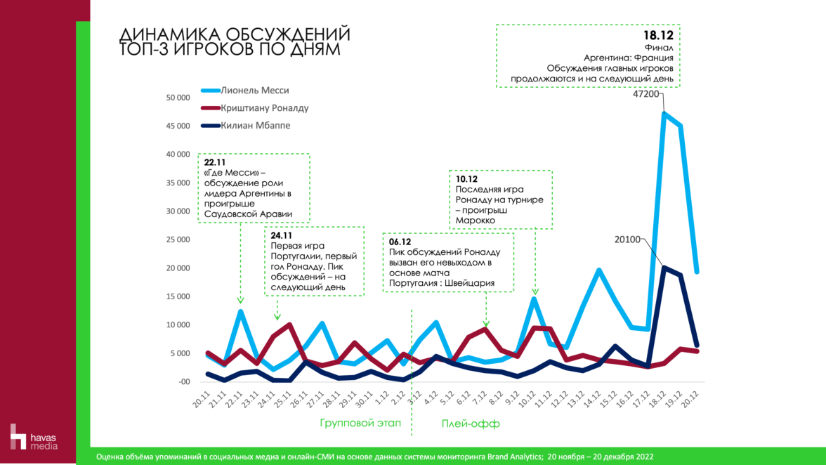 У Лионеля Месси стабильные пики обсуждений после каждой игры Аргентины, максимальная точка упоминаний игрока — финал чемпионата.