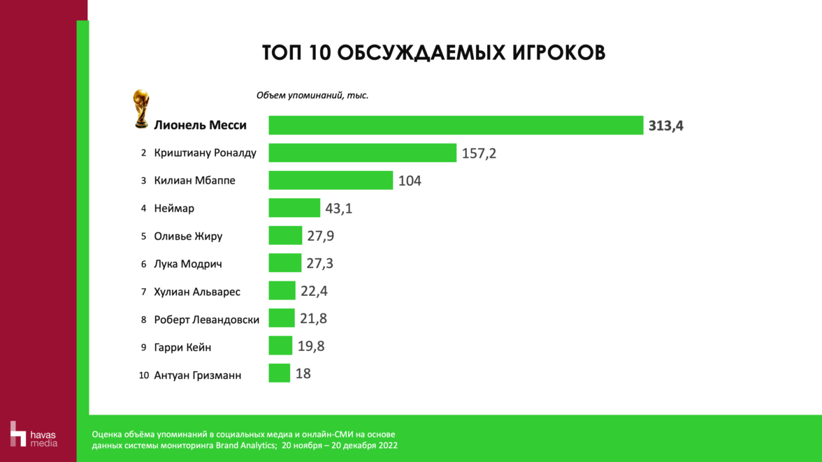 Лионель Месси в два раза обогнал по числу упоминаний Криштиану Роналду. В свою очередь, Килиану Мбаппе не удалось обогнать Криштиану Роналду.