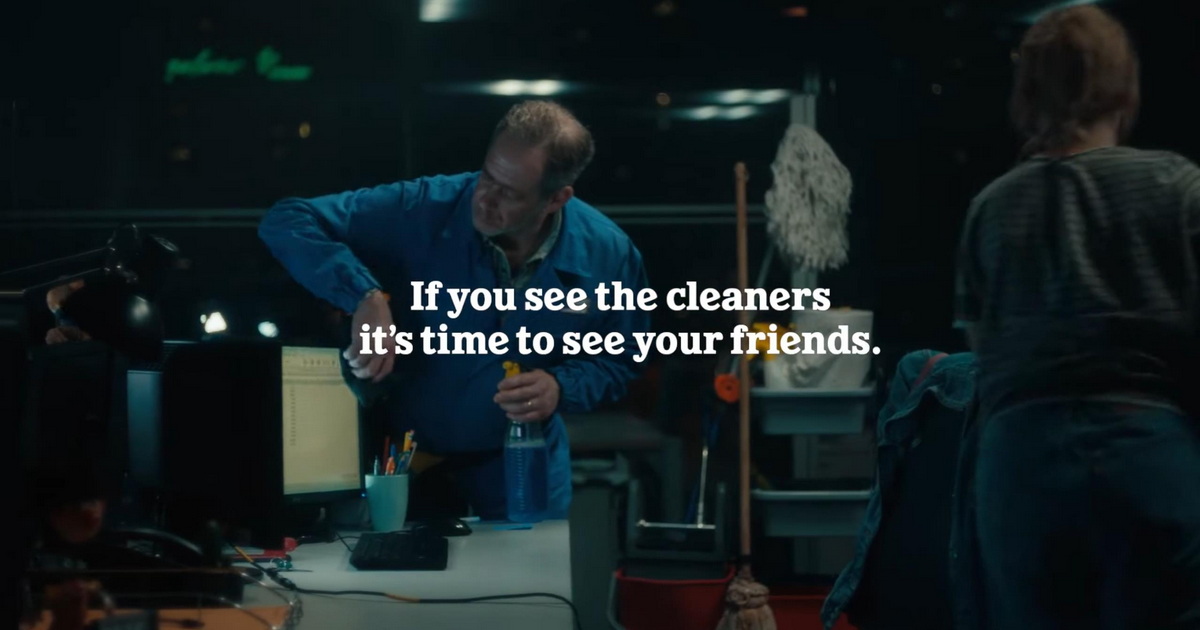 Ролик заканчивает фраза «Если вы видите уборщика — пришло время увидеть друзей!»