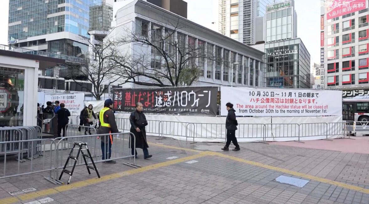 Статуя собаки Хатико на время Хэллоуина ограждена от беспокойных любителей этого праздника.