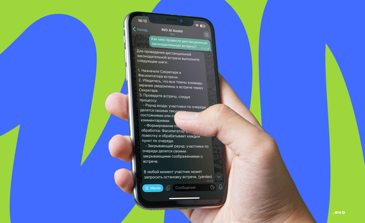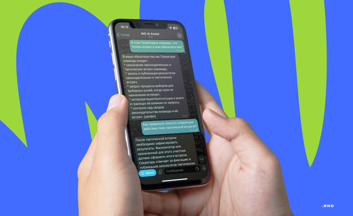 Иностудио разработала ИИ-чат-бота для Telegram, который помогает сотрудникам быстро находить информацию по холакратическим регламентам. Решение ускоряет адаптацию новых сотрудников и снижает нагрузку на HR.