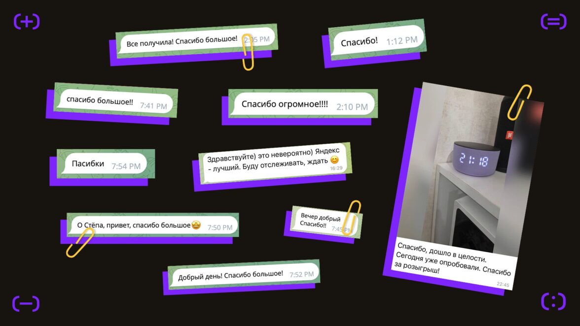Особенно запомнился парень, который сомневался с первого сообщения. Когда мы написали ему, что он выиграл Яндекс Станцию, он сказал, что никогда в жизни ничего не выигрывал. Но всё-таки дал нам свой адрес и когда получил посылку, написал сообщение с благодарностью.