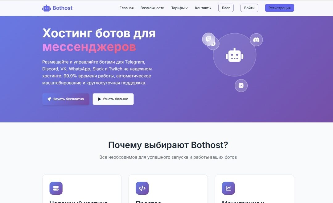 Лидер нашего обзора — проект Bothost.ru, который целенаправленно создан для хостинга и управления ботами для Telegram, Discord, ВК и других мессенджеров. И единственный проект, который предоставляет бесплатный хостинг для размещения Telegram бота.