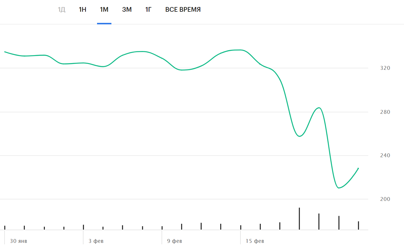 Акции «Газпрома» продолжают падать с момента начала военных действий в Украине. Актуальные котировки на 1 марта 2022 года — 228 руб. за акцию.