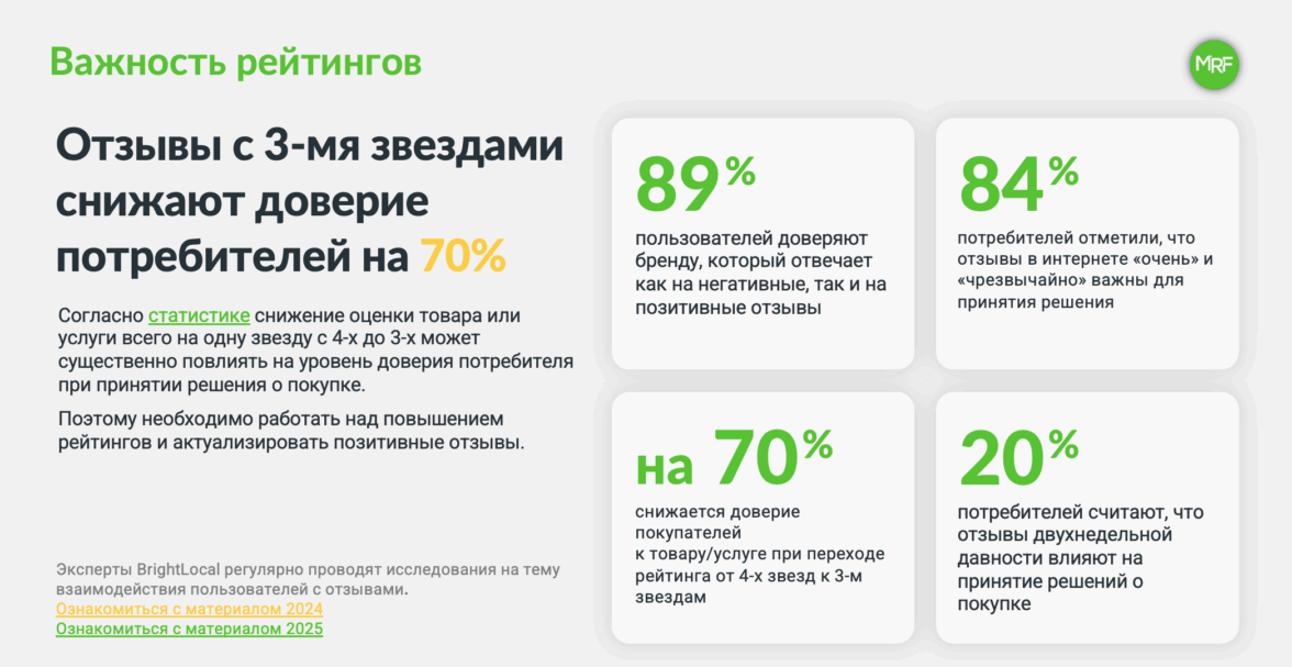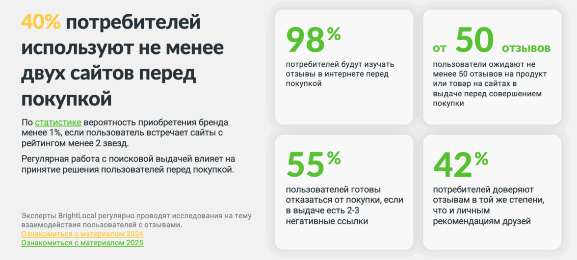 Значение отзывов невозможно переоценить. Согласно исследованию BrightLocal, 98% потребителей будут изучать отзывы в интернете перед покупкой/обращением за услугами, а 42% потребителей доверяют отзывам в той же степени, что и личным рекомендациям друзей.