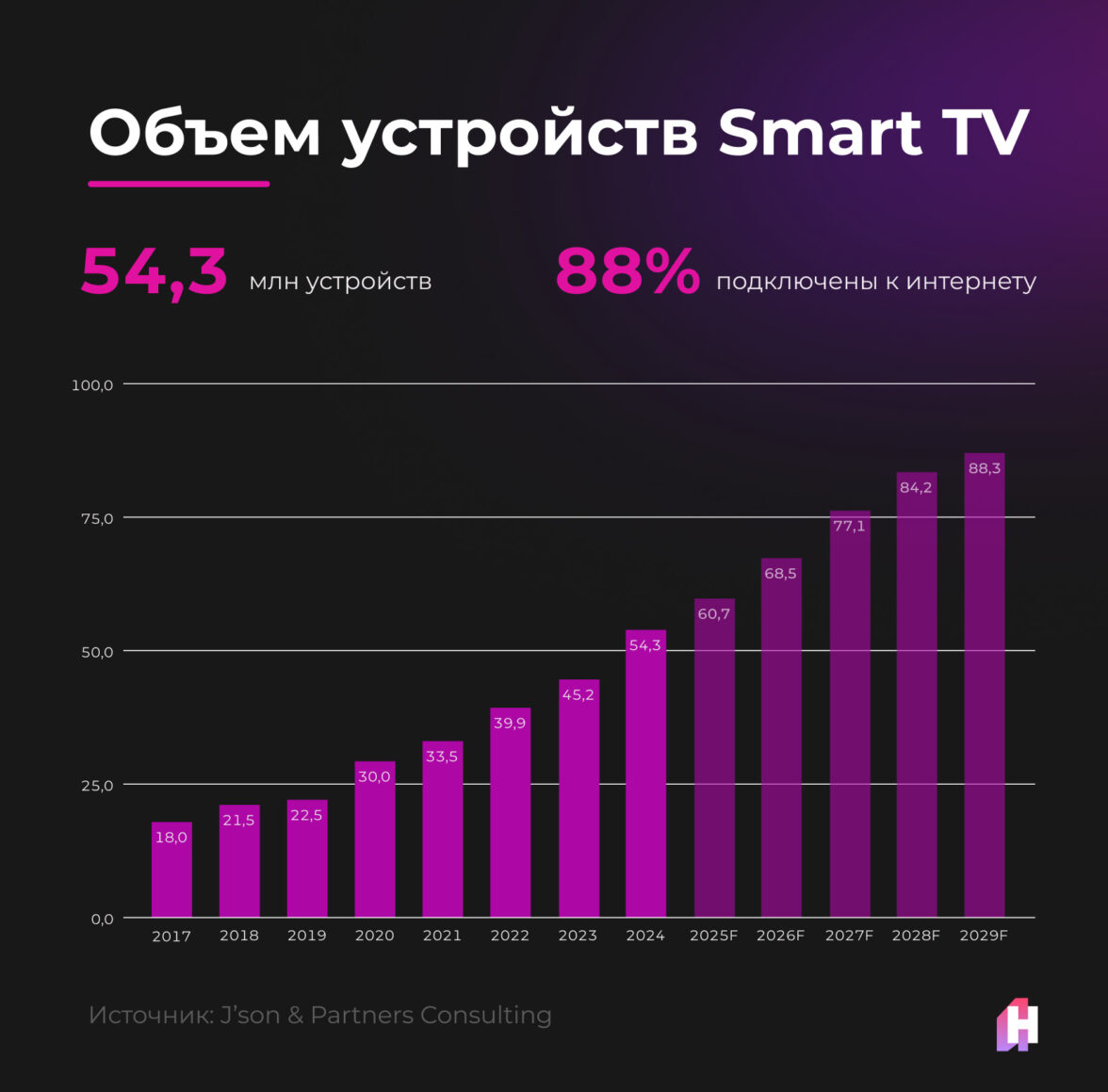 По прогнозам, в 2024 году выручка российского рынка «умных» телевизоров составит около 7,6 млрд долларов США, а к 2030 году достигнет 14,5 млрд долларов США, что соответствует среднегодовому темпу роста (CAGR) в 11,3%. Смарт-телевизоры становятся все более распространенными, на них приходится более 85% всех продаж телевизоров в прошлом году, а, например, в сети «М.Видео-Эльдорадо» — более 90%.