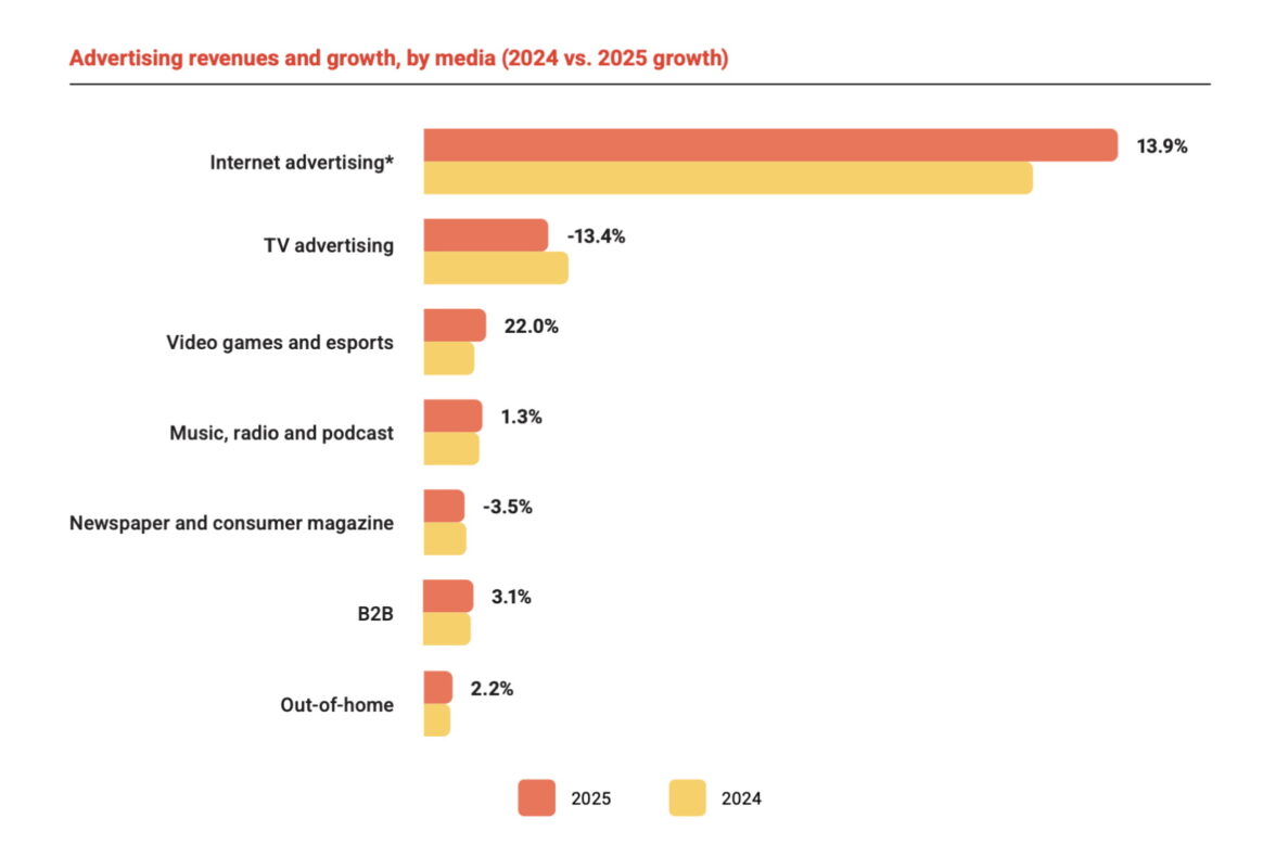 В 2025 году наблюдался более сильный сдвиг в сторону цифровой рекламы по сравнению с нецифровыми медиа, при этом рост телевизионной рекламы снизился по сравнению с 2024 годом.