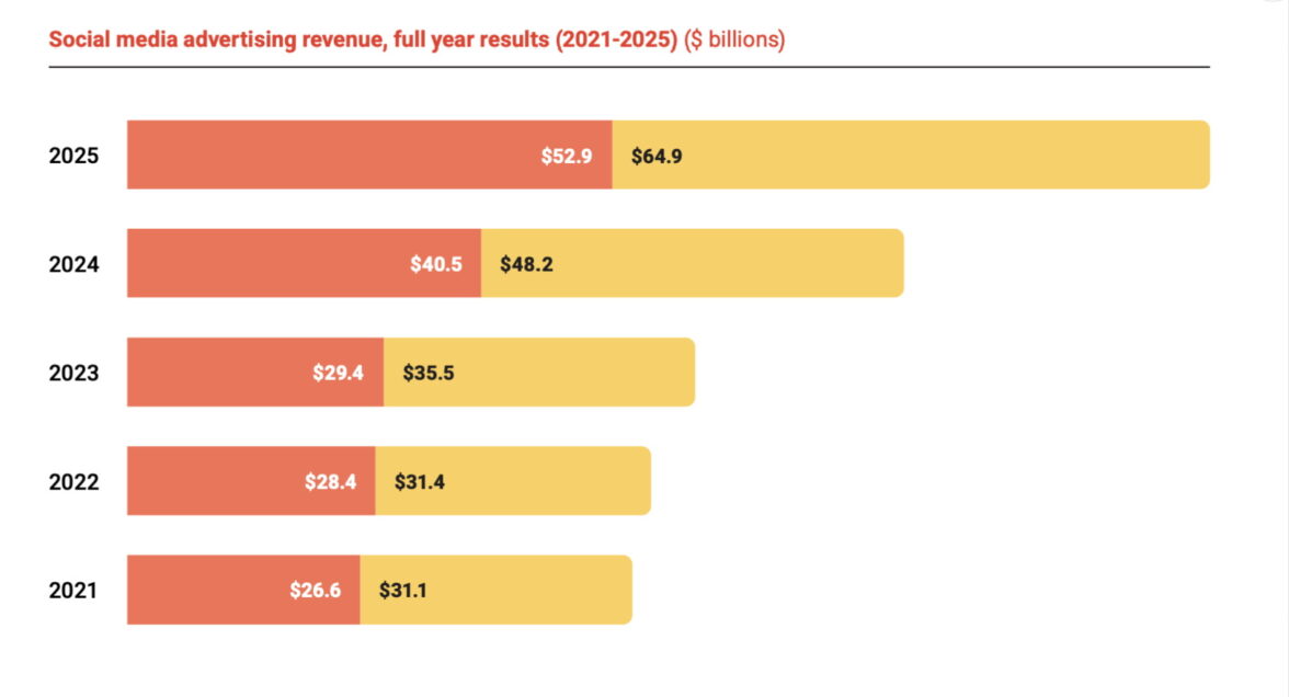 Выручка от рекламы в социальных сетях в США в 2021–2025 гг. Красный — первая половина года, желтый — вторая половина года. Источник: IAB / PwC Internet Ad Revenue Report, FY 2025.