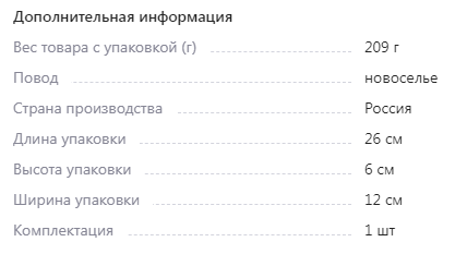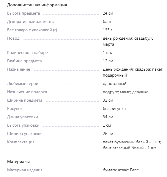 Здесь же характеристики указаны достаточно подробно, этот товар показывается при использовании многих фильтров — к примеру, когда ищут подарочный пакет на свадьбу.