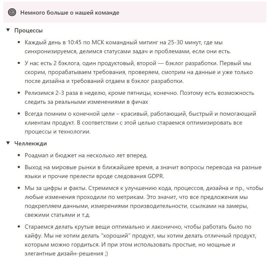 В тексте вакансии мы не только подробно описываем обязанности и требования к кандидату, но и рассказываем о рабочих процессах. Так человек придет на первый созвон уже информированным.
