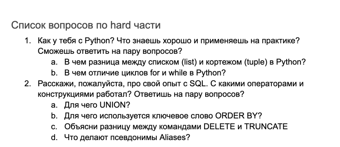 Для каждого направления скрипты и вопросы разные, а еще мы часто их модифицируем в зависимости от уровня и бэкграунда соискателя. Отличается и сам порядок проведения интервью.