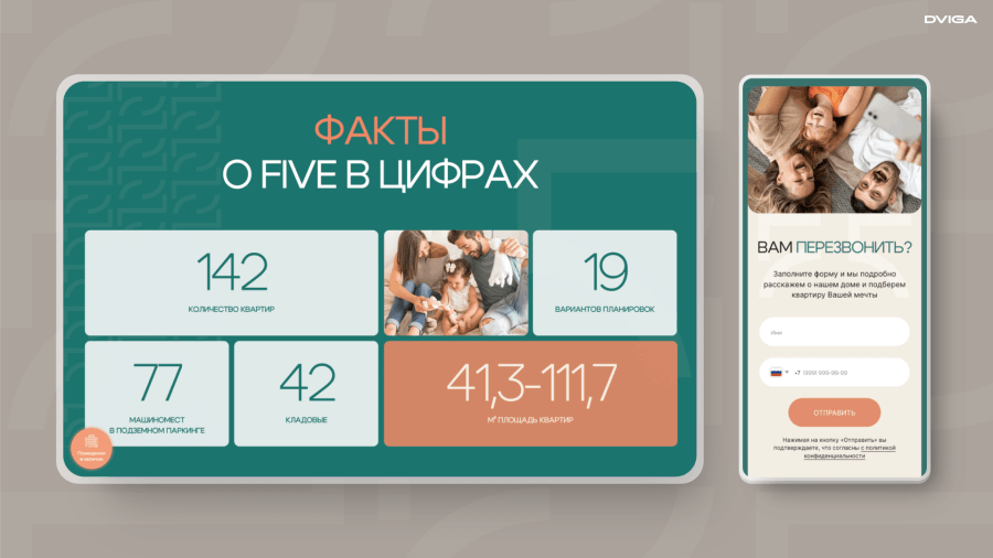 Заголовки и тексты на сайте проработаны таким образом, что дополняют позиционирование бренд. Все тезисы и ключевые фразы «крутятся» вокруг названия дома: «Жизнь на отлично начинается с FIVE», «Пять причин выбрать FIVE» и так далее. Благодаря этому нативному триггеру клиент запоминает проект уже после первого взаимодействия.