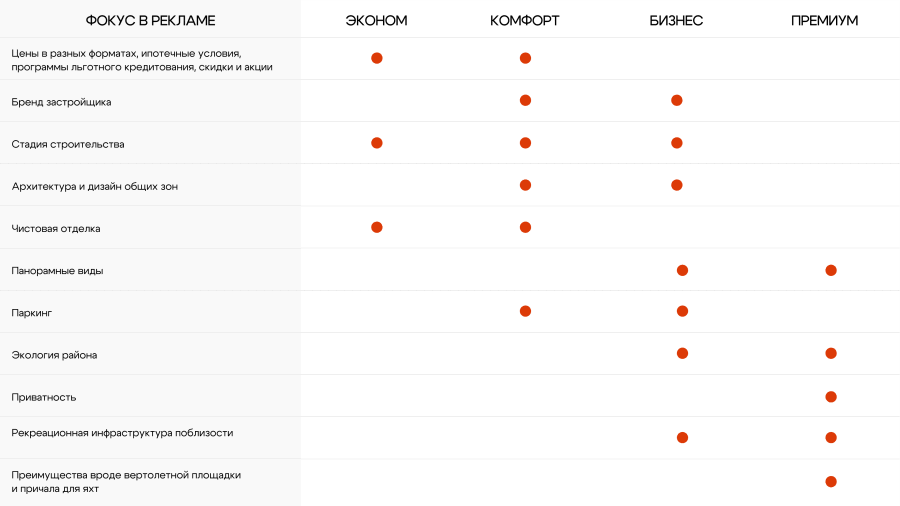 Если суммировать, то получается вот такая таблица со смысловыми акцентами в рекламе для разных классов жилья.