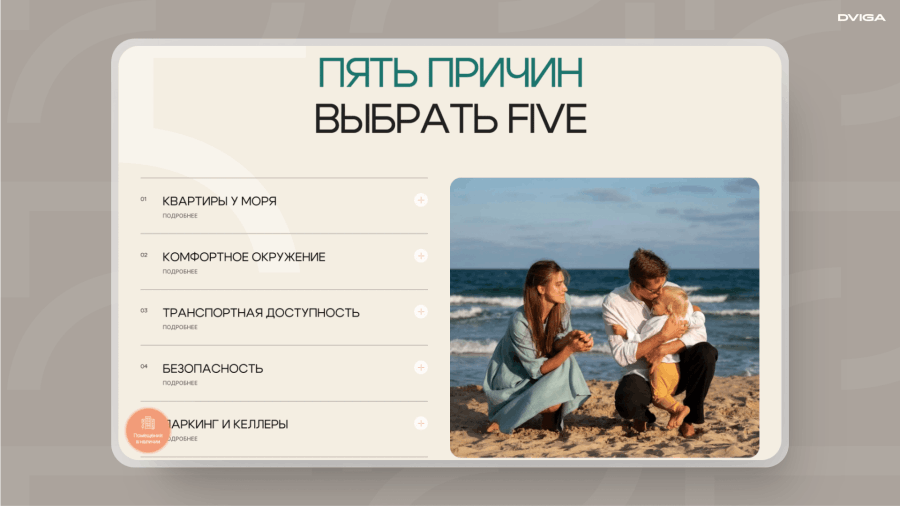 Например, родителям важна социальная инфраструктура, поэтому в первую очередь они прочитают о школах и больницах неподалеку, затем — о безопасности на территории ЖК и транспортной доступности. Для пар без детей интересна информация о близости к морю, системе «Умный дом» и паркинге. То есть пользователь сам может выбирать сценарий изучения ЖК в зависимости от приоритетов в выборе жилья.