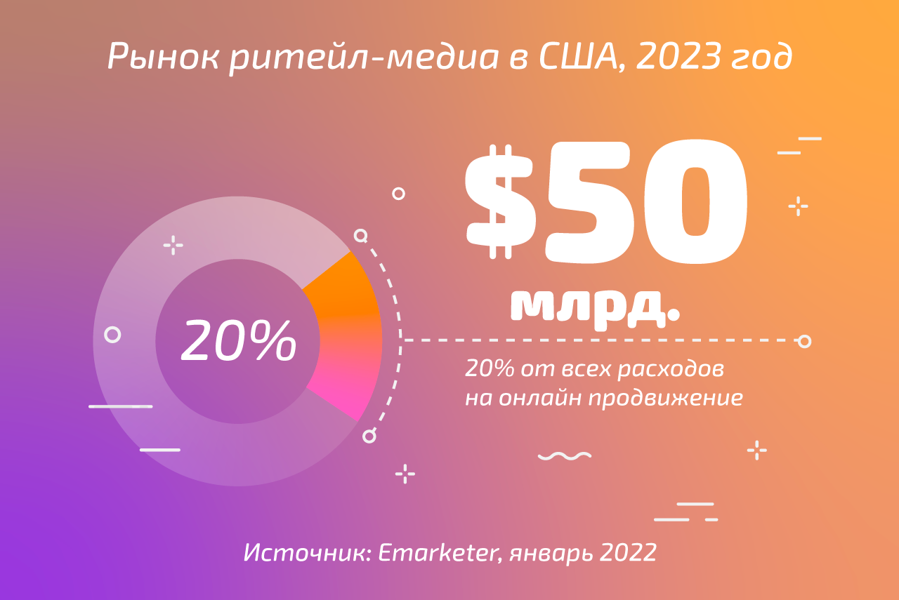 Опыт развитых рынков свидетельствует, что подобные идеи уже овладели массами не только работников рекламного бизнеса, но и рекламодателей. В компании Emarketer в январе этого года заявили, что к 2023 году объем рынка ритейл-медиа в США достигнет $50 млрд, причем на него придется почти 20% всех расходов на цифровую рекламу.