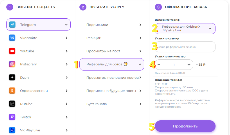 Для заказа рефералов OrbitonX Game в сервисе SMMstar нажмите на услугу Рефералы для ботов, затем выберите тариф Рефералы для OrbitonX Game, укажите свою реферальную ссылку и количество рефералов. По желанию укажите почту, если вы не авторизовались до этого и нажмите Продолжить, после чего следуйте подсказкам на экране.