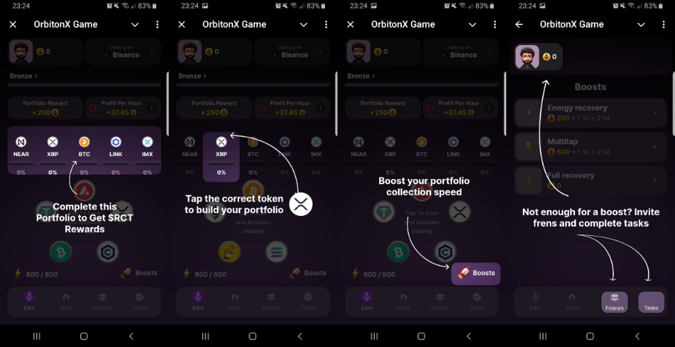 На этапе текущем этапе нам доступен квест-кликер, сбор комбо и улучшения, различные простые задания и приглашение рефералов в игру. При первом входе в OrbitonX вас ждет онбординг, где объясняют, как играть.
