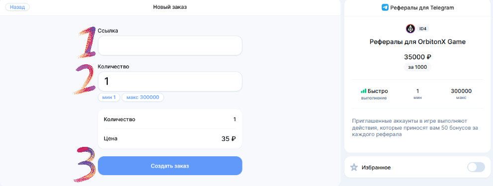 Для заказа рефералов OrbitonX Game в сервисе Рефералы Телеграм найдите карточку Рефералы для OrbitonX Game и нажмите Купить. Затем укажите свою пригласительную ссылку, нужное количество рефералов и нажмите Создать заказ, после чего следуйте подсказкам на экране.
