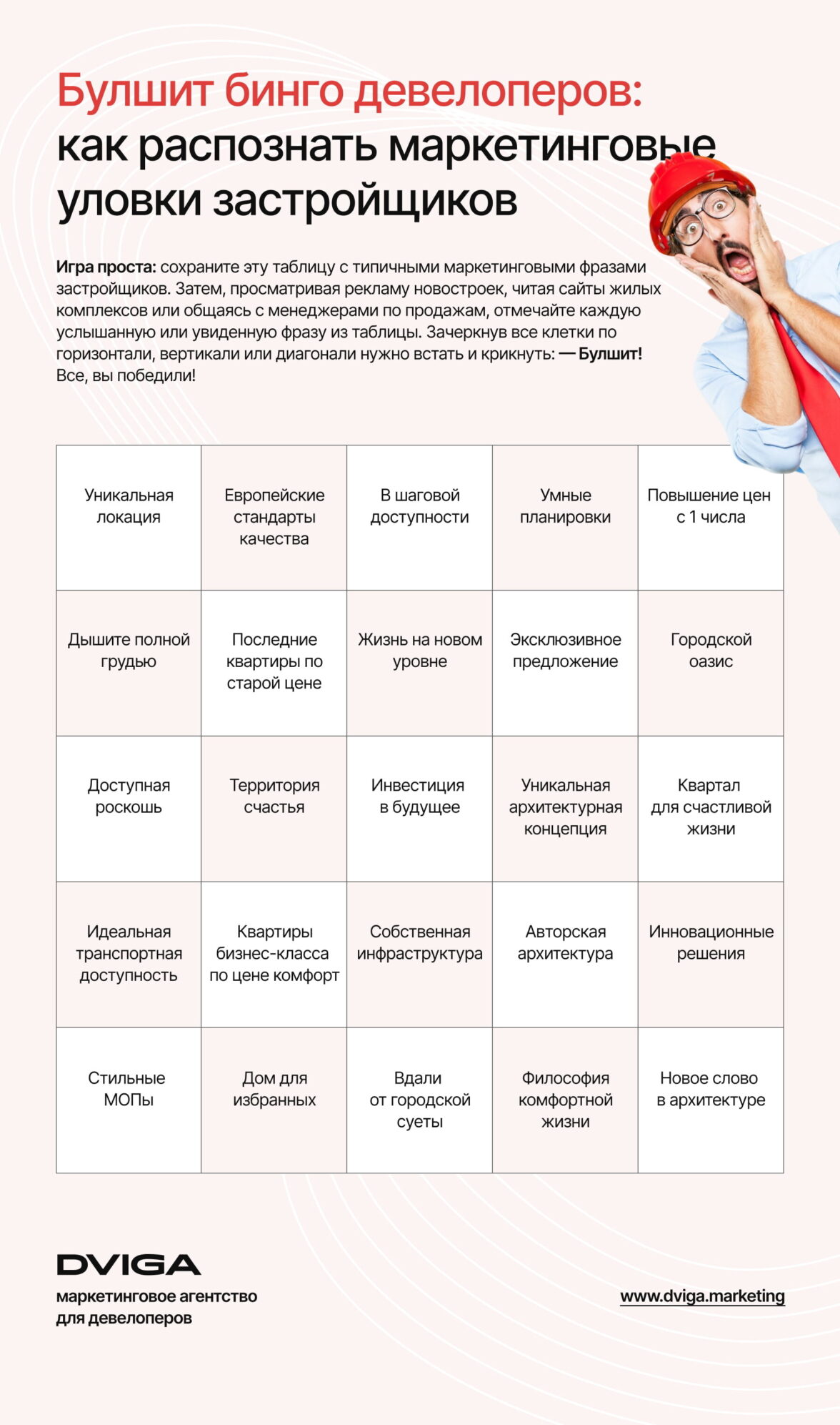 Игра проста: сохраните эту таблицу с типичными маркетинговыми фразами и УТП застройщиков. Затем, просматривая рекламу новостроек, читая сайты жилых комплексов или общаясь с менеджерами по продажам, отмечайте каждую услышанную или увиденную фразу из таблицы. Зачеркнув все клетки по горизонтали, вертикали или диагонали нужно встать и крикнуть: — Булшит!