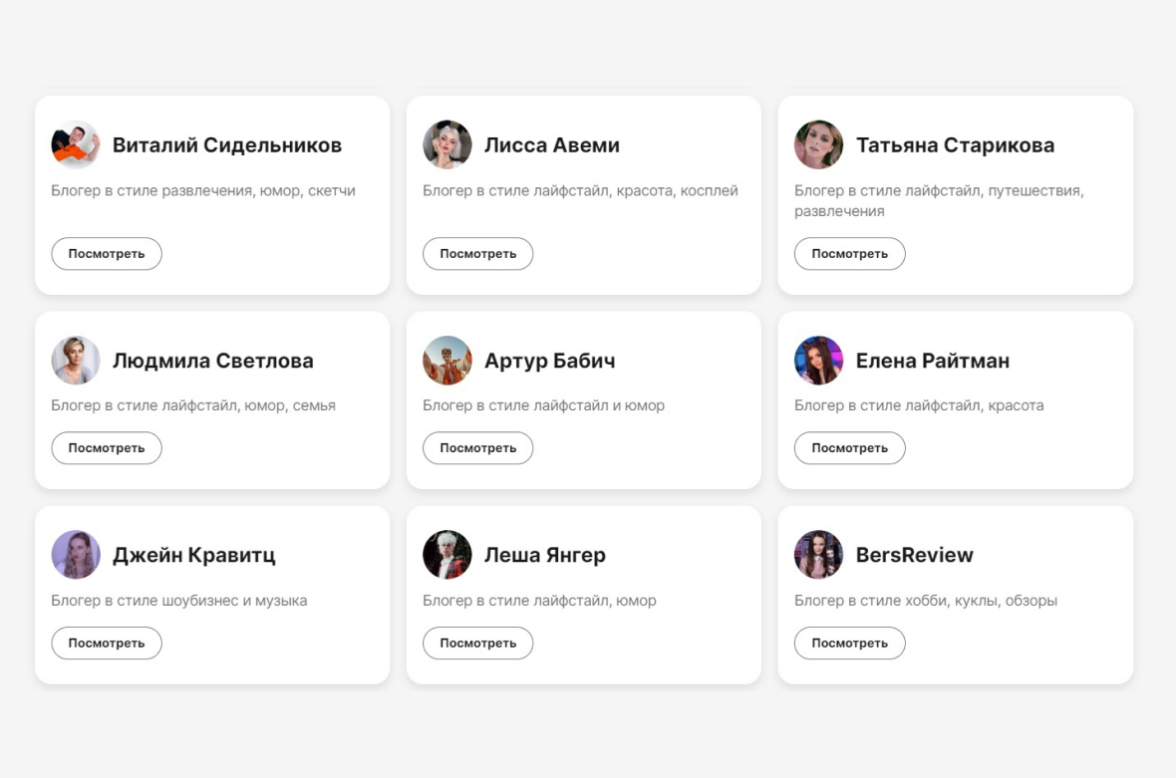 На витрине размещается 39 блогеров-миллионников в разных нишах — клиент может выбрать инфлюенсера под свою рекламную кампанию